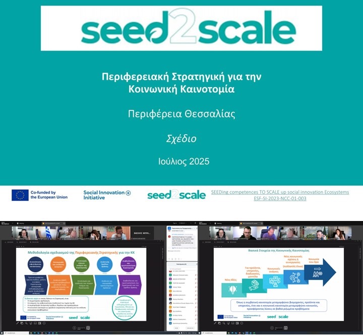 Στο πλαίσιο του ευρωπαϊκού έργου SEED2SCALE, παρουσιάστηκε, σήμερα Δευτέρα 28/07/2025, το σχέδιο Περιφερειακής Στρατηγικής για την Κοινωνική Καινοτομία (ΚΚ) στην Περιφέρεια Θεσσαλίας, σε διαδικτυακή συνάντηση με τη συμμετοχή εκπροσώπων φορέων της τετραπλής έλικας, δηλαδή δημόσιων φορέων, πανεπιστημίων, φορέων της κοινωνίας των πολιτών και του ιδιωτικού τομέα.